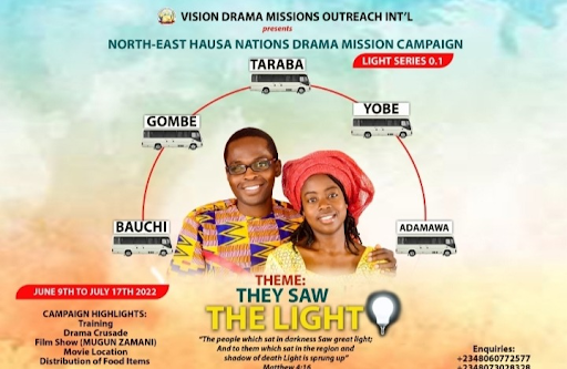Vision Drama Mission Outreach International is a drama and film outreach based in Abuja, Nigeria. It has a primary assignment centered on drama missions, with a view to reaching the Hausas, Muslims and the unreached people of the world through drama missions campaigns.